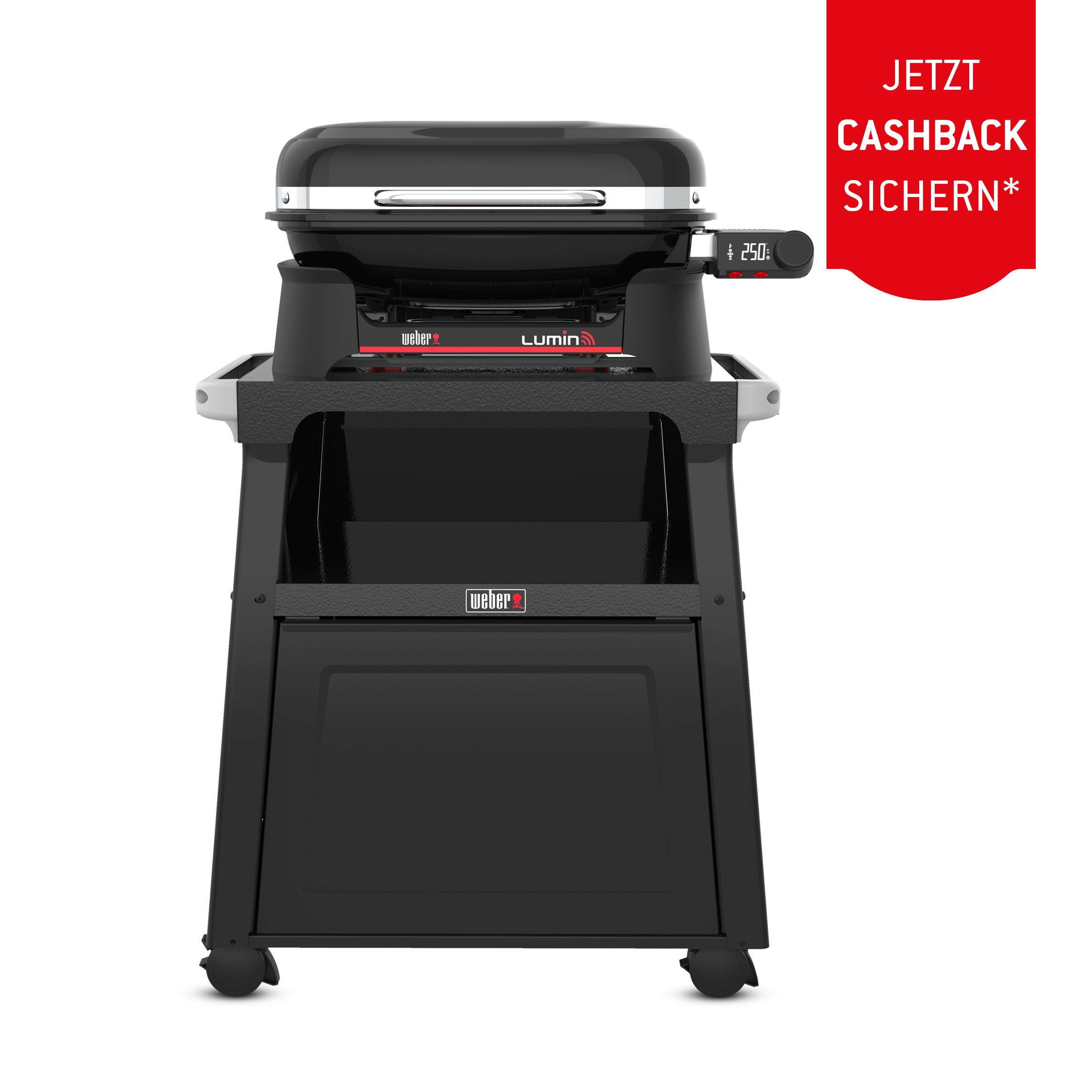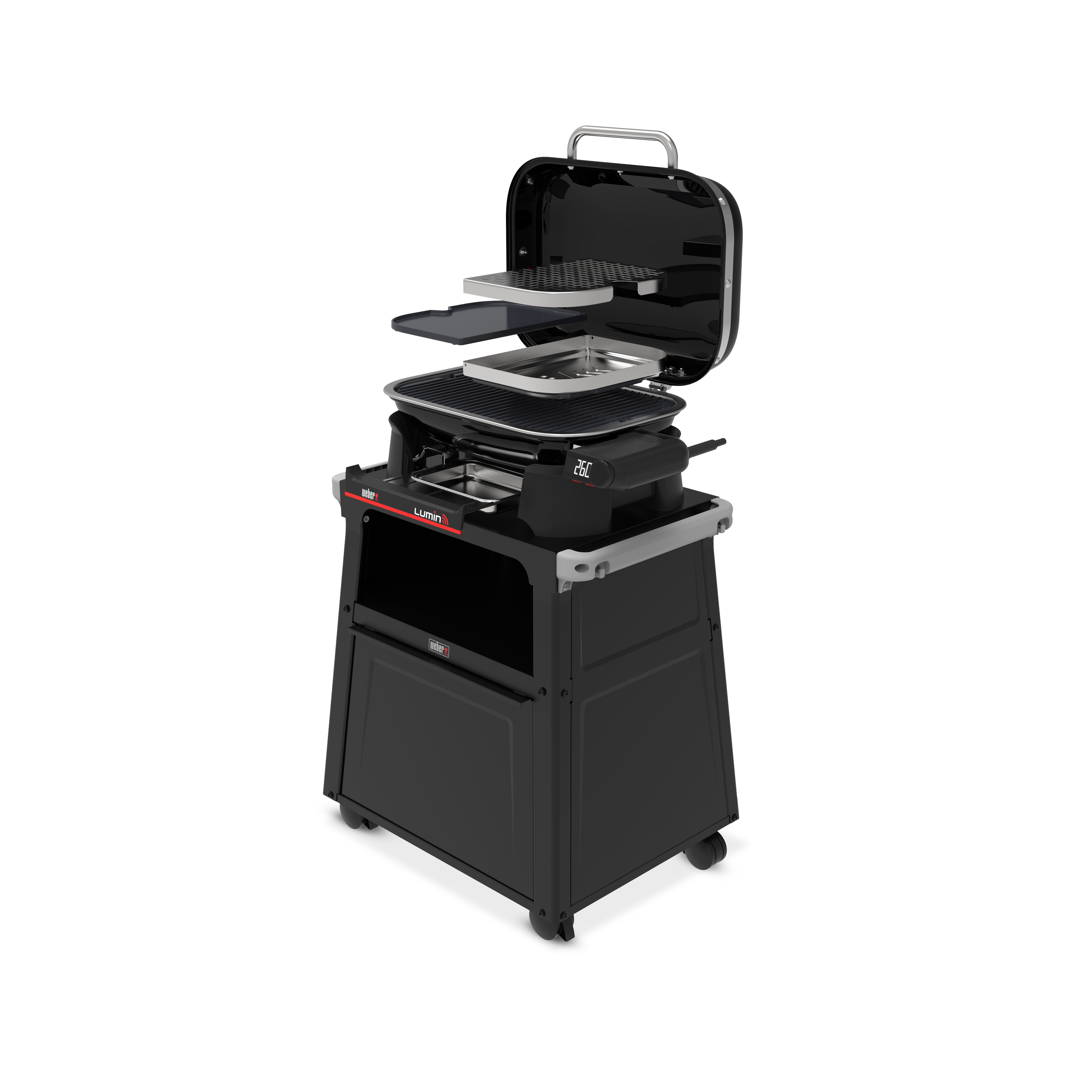 Genießen Sie köstlichen Grillgeschmack ganz ohne offene Flamme mit dem Lumin® Smart Elektrogrill für den Außenbereich. Er verfügt über einen LCD-Controller mit WLAN-Funktion und einen Premium-Wagen. Schließen Sie ihn einfach auf Ihrer Terrasse oder im Garten an und stellen Sie die Temperatur präzise am Grill oder bequem per Smartphone mit der Weber Connect® App ein. Der Grill heizt in nur 15 Minuten auf und erreicht Temperaturen von über 315 °C für perfekt angebratenes Fleisch und Meeresfrüchte. Mit dem intelligenten Fleischthermometer erhalten Sie eine präzise Garanleitung sowie Hinweise zum Wenden und Servieren. Der Premium-Wagen lässt sich dank vier feststellbarer Rollen mühelos bewegen und bietet mit seinem geschlossenen Ablagefach in der Mitte und den seitlichen Schienen, an denen Weber Works Zubehör (separat erhältlich) befestigt werden kann, zusätzlichen Stauraum. Entdecken Sie weitere Möglichkeiten für Ihr Outdoor-Grillerlebnis: Die mitgelieferte Grillplatte eignet sich ideal für beliebte Gerichte wie Smashburger, Pfannkuchen, Eier und Wokgerichte. Der mitgelieferte Räucherbehälter ermöglicht Ihnen das langsame Garen bei niedriger Temperatur. Nutzen Sie den Dampfgarer/Räucherbehälter, um Ihren Speisen ein Raucharoma zu verleihen, Fisch und Gemüse zu dämpfen oder Tiefkühlkost zuzubereiten. Der vielseitige und moderne Lumin® Smart Elektro-Außengrill mit Premium-Wagen bietet vollen Geschmack auf kleinem Raum.